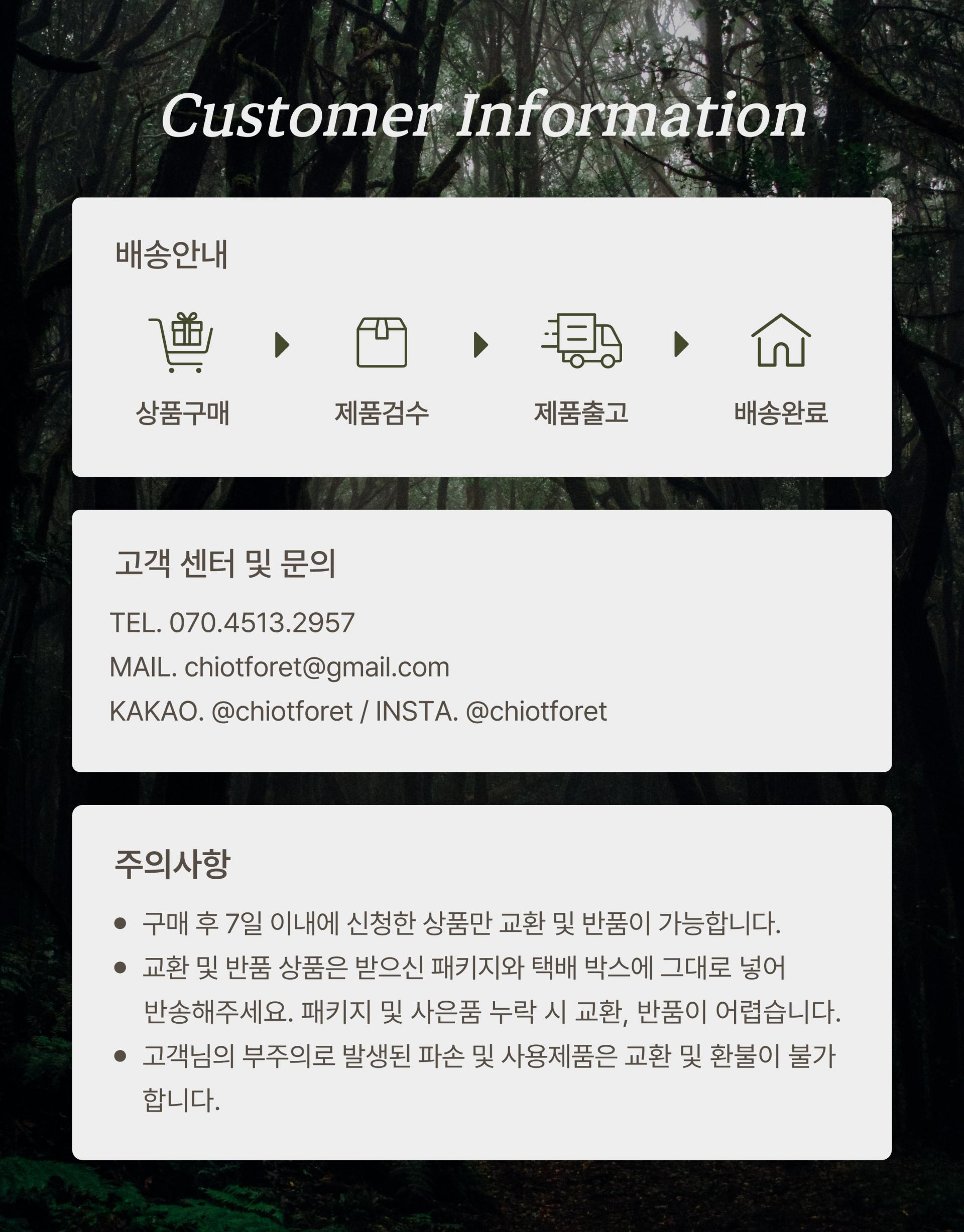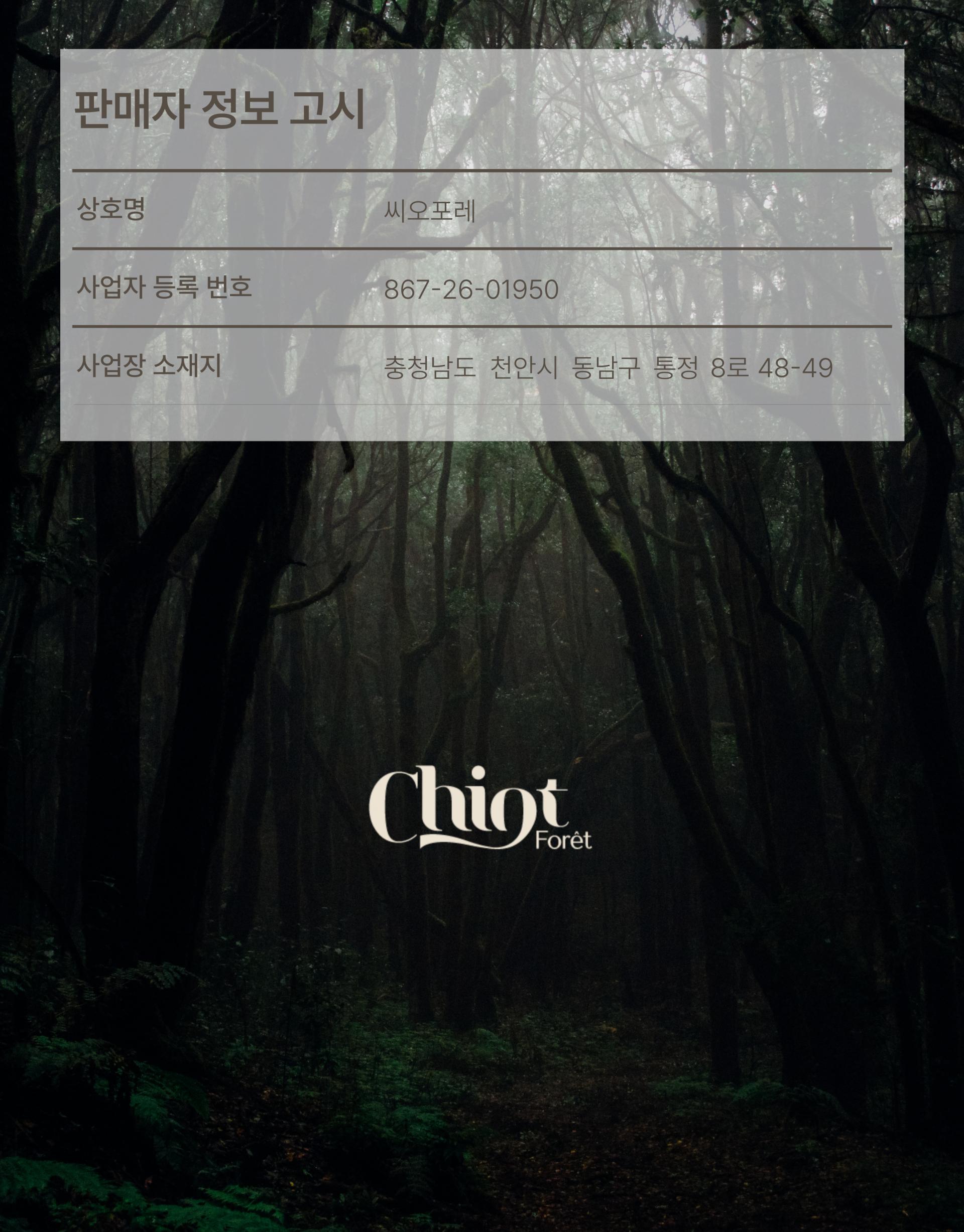고객센터 및 문의 : chiotforet@gmail.com ㅣ 평일 : 10:00~18:00, 점심 : 12:00~13:00