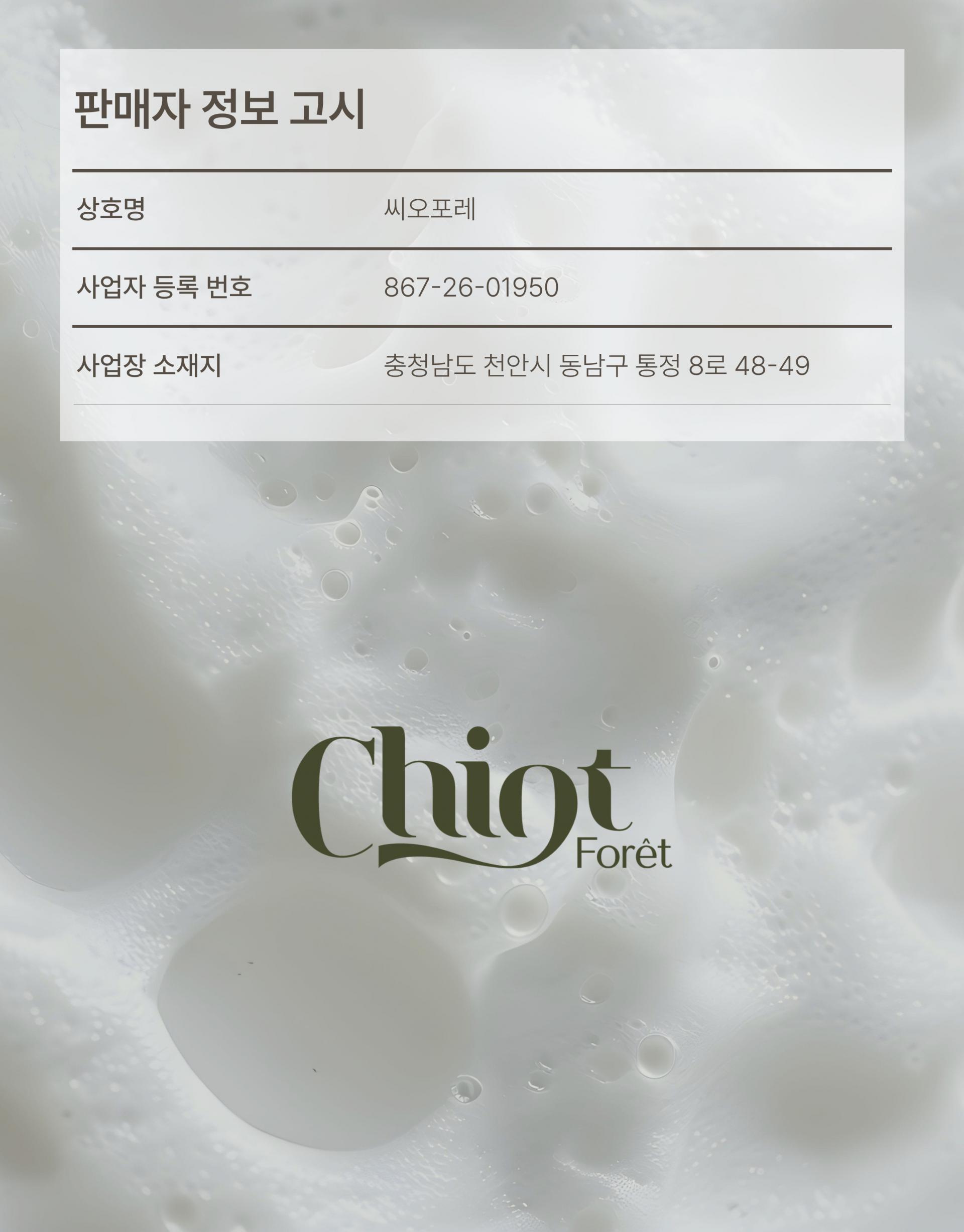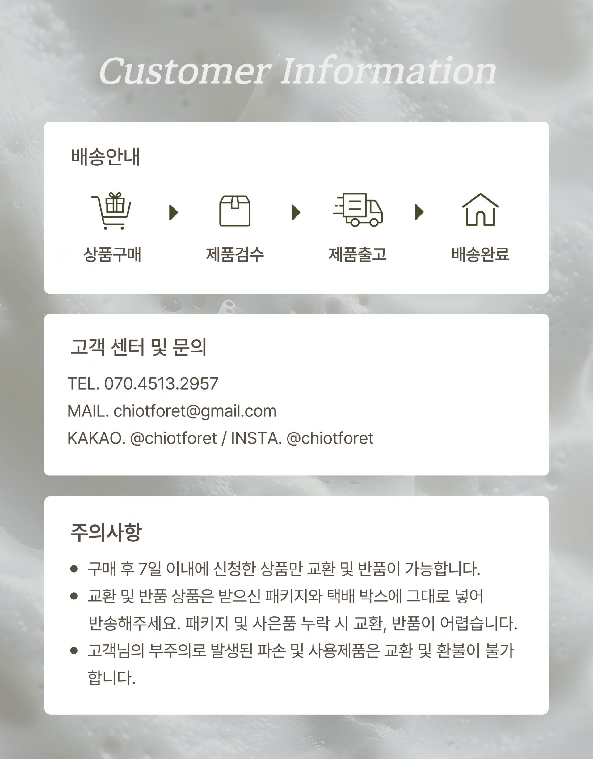 고객센터 및 문의 : chiotforet@gmail.com ㅣ 평일 : 10:00~18:00, 점심 : 12:00~13:00