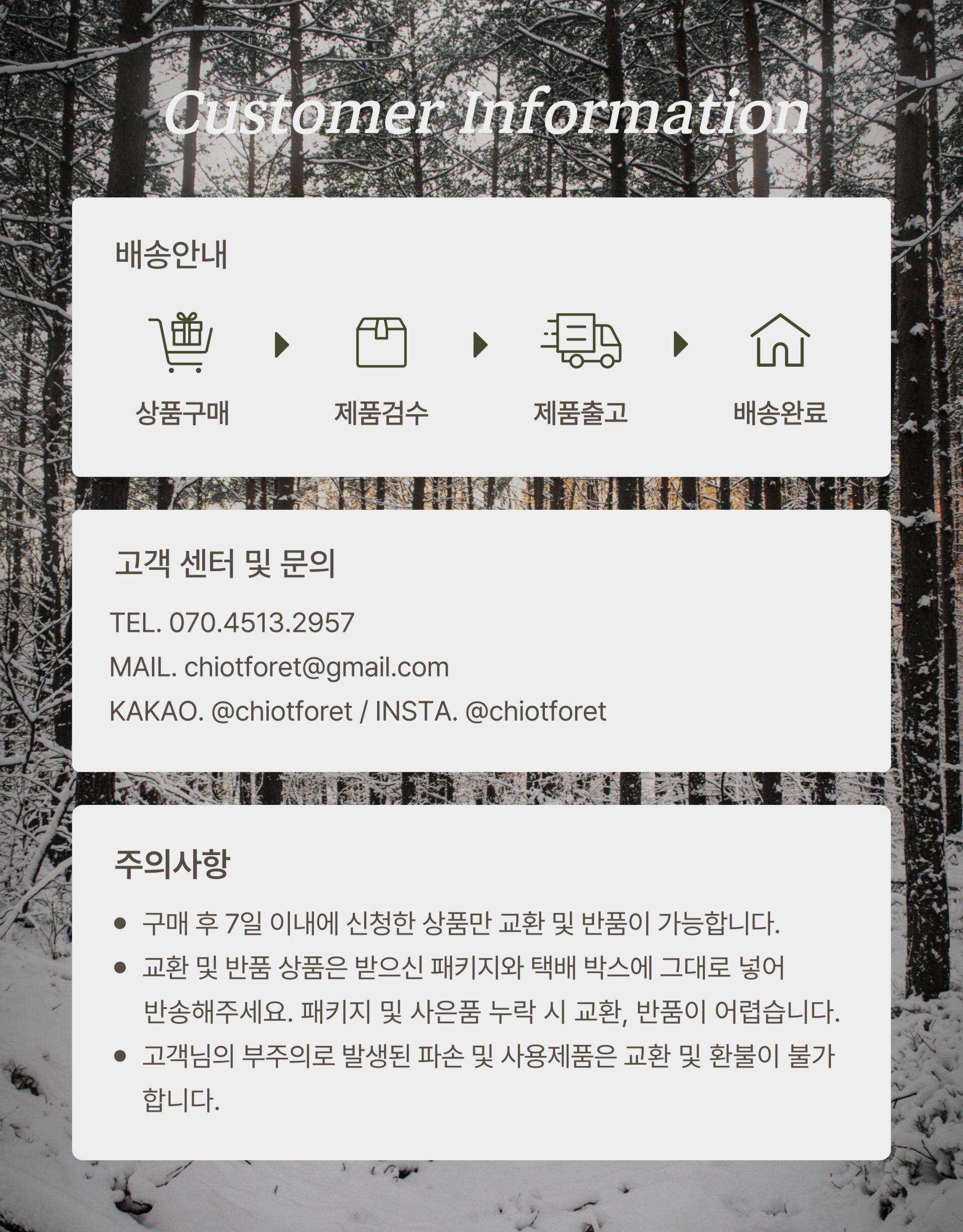 고객센터 및 문의 : chiotforet@gmail.com ㅣ 평일 : 10:00~18:00, 점심 : 12:00~13:00